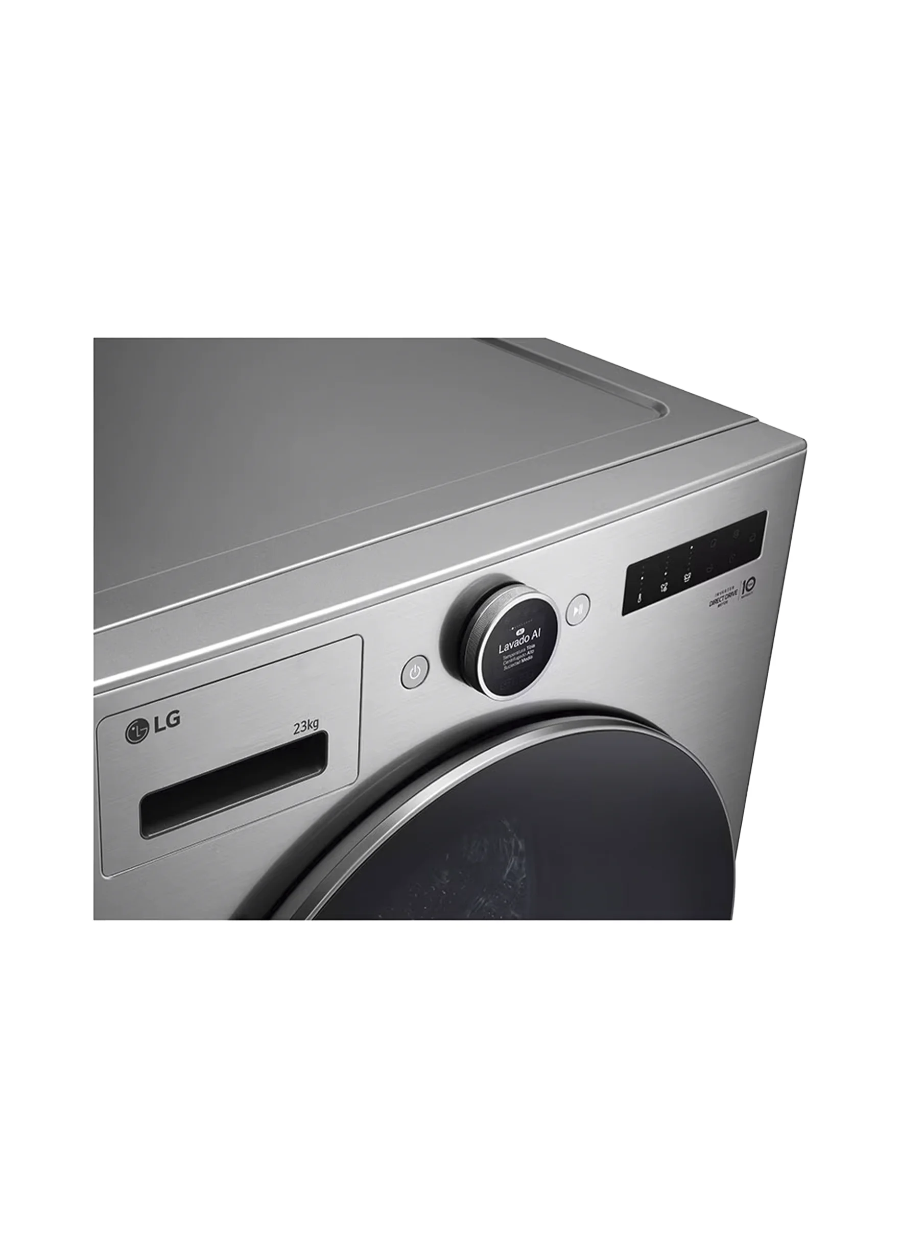 Lavadora LG de carga frontal con capacidad de 23 kg y tambor de acero inoxidable. Incluye tecnología AI DD con inteligencia artificial para detectar tipo de tejido y peso, TurboWash360 para lavado rápido en 30 minutos, vapor Steam para sanitización, motor Inverter Direct Drive con 6 movimientos de lavado, dispensador automático de detergente y conectividad LG ThinQ para control remoto.