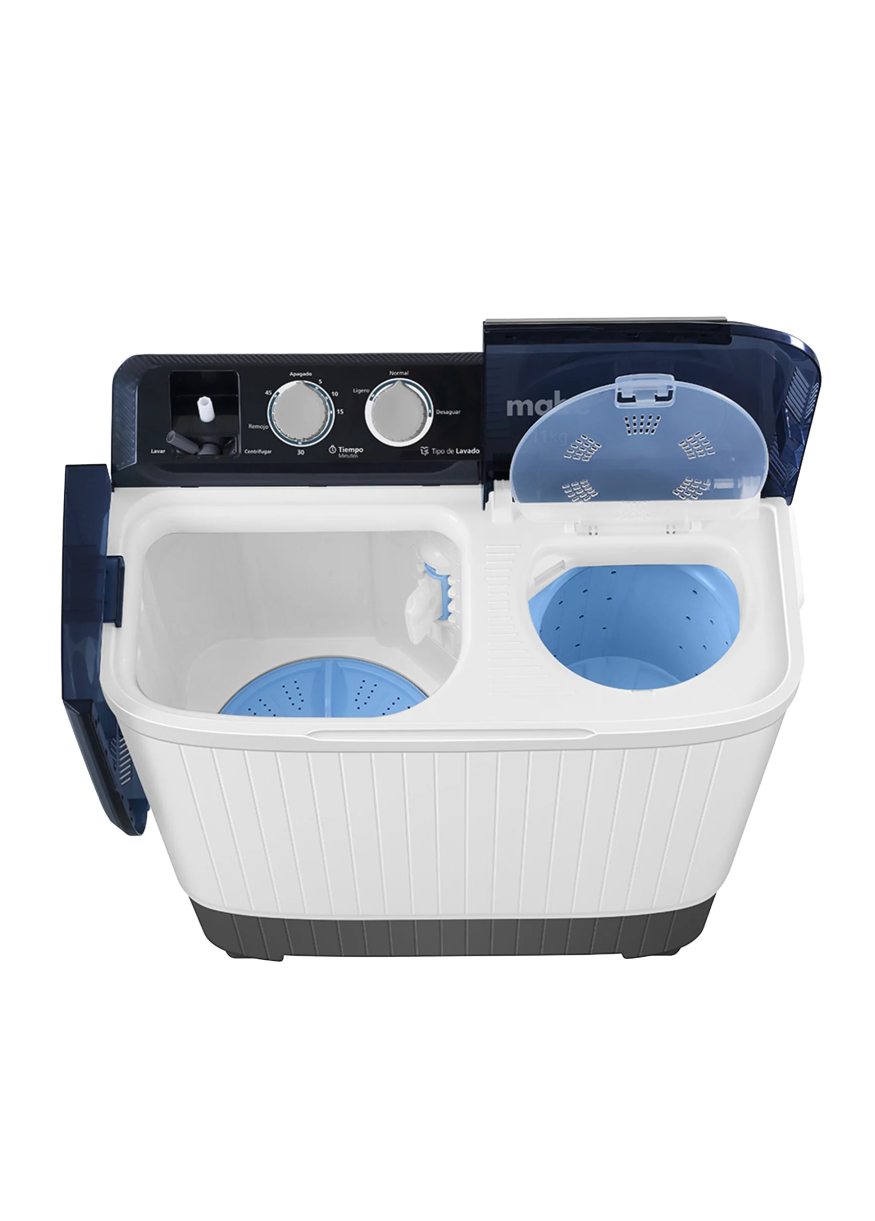 Lavadora semiautomática Mabe de 2 tinas con capacidad de 11 kg y diseño blanco con acabados azules. Equipada con tecnología Safe & Clean con recubrimiento antibacterial en propela y centrifugado, sistema Air Vent para circulación de aire, filtro Magic Filter removible, tapa desmontable con soportes laterales, sistema de lavado tipo propela, 6 niveles de agua, panel mecánico con 3 perillas y voltaje de 127V 60Hz.