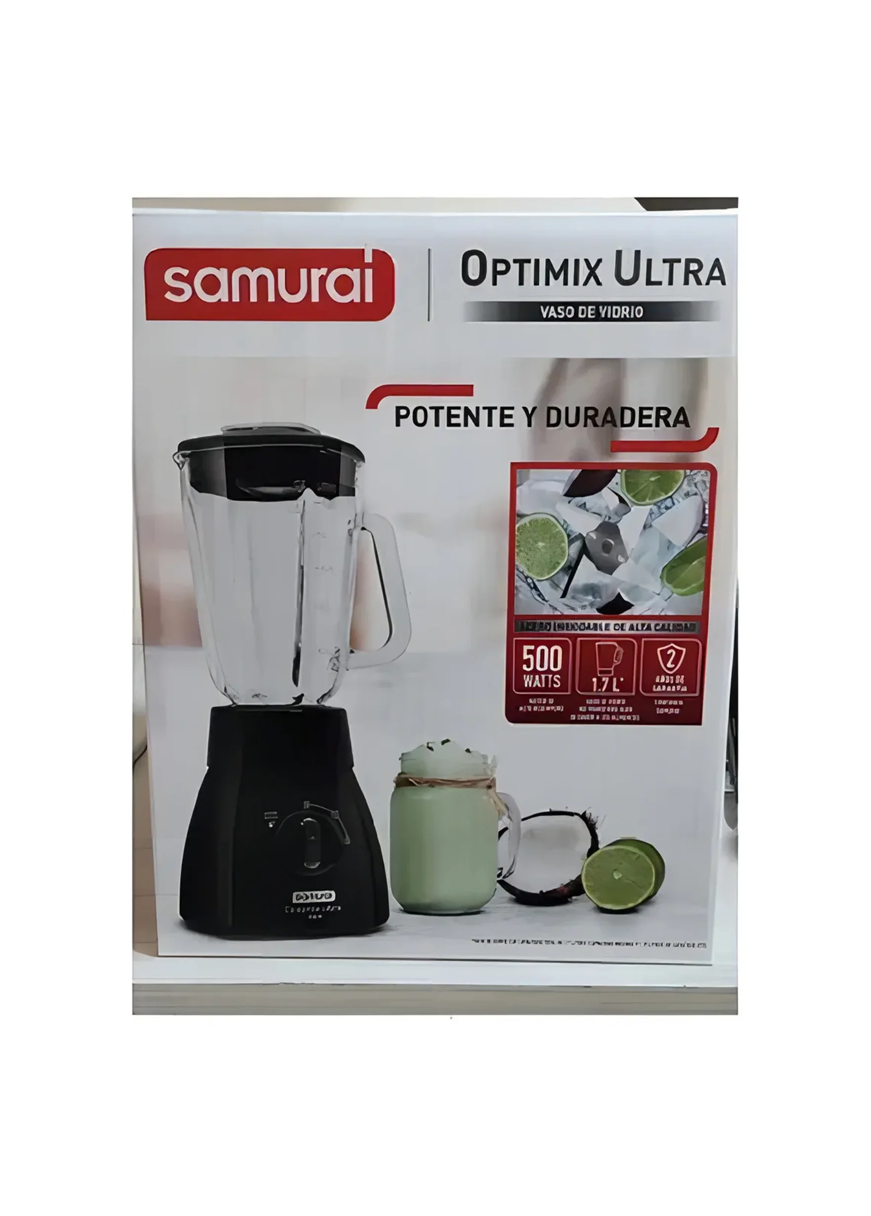 Licuadora Samurai Optimix Plus con vaso de vidrio en color negro, equipada con motor de 500 watts y jarra de 1,7 litros de capacidad total (1,25 litros útiles). Dispone de 2 velocidades más función pulso, cuchillas de acero inoxidable de 4 aspas para triturar hielo, sistema de acople en policarbonato resistente, base antideslizante, tapa con dosificador y piezas desmontables aptas para facilitar la limpieza.